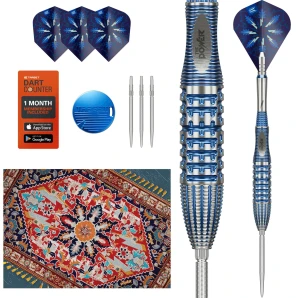 Wykonane w 95% z wolframu, barrel ma klasyczny, torpedowy kształt z wyważeniem front-weighted, zapewniającym płynne i kontrolowane wypuszczenie lotki. Quattro grip łączy frezowanie CNC z kwadratowymi nacięciami, tworząc unikalną strukturę pokrytą elektrycznoniebieską powłoką z tytanowego nitridu — wykończeniem równie efektownym jak dziedzictwo Phila Taylora.