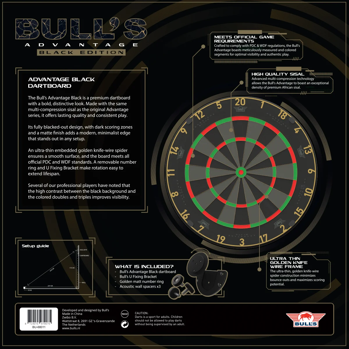 Odkryj tarczę do darta Bull's Advantage Black, najnowszą ewolucję precyzyjnych tarcz od Bull's, teraz w śmiałej, wysokokontrastowej czarnej odsłonie.