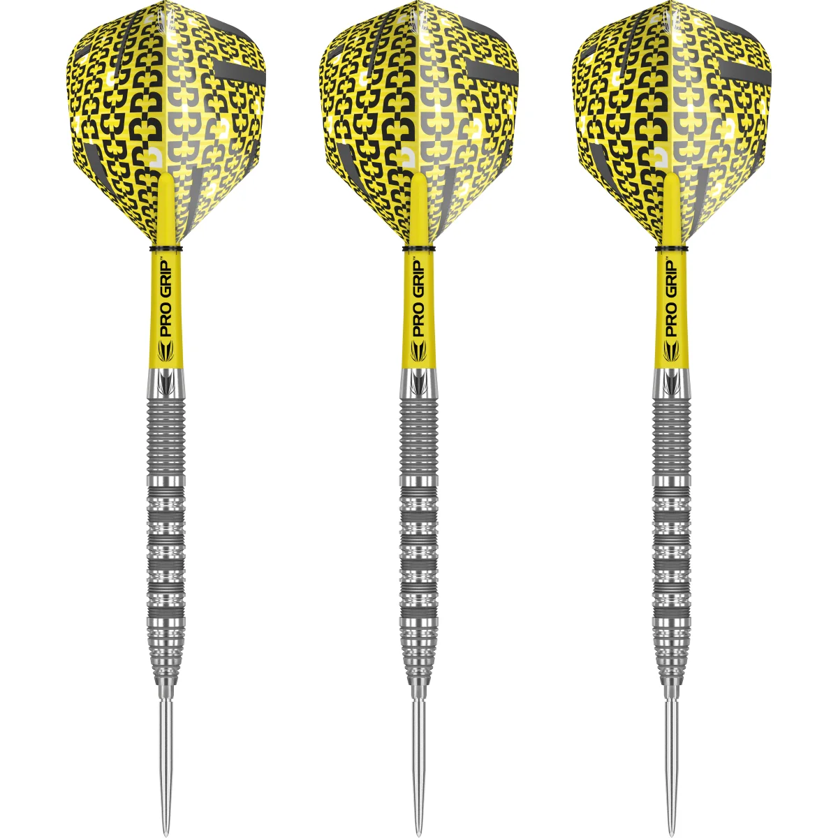 Seria Bolide oferuje dwa różne wzory bareli dla lotek z miękkim grotem, zapewniając rozwiązania dla różnych chwytów i stylów gry. Barele są misternie wykonane z precyzyjnymi, promieniowymi nacięciami oraz ręcznie piaskowaną powłoką, co zwiększa przyczepność i odczucie lotki. Każdy barel jest wykończony żółtym trzonkiem Pro Grip i efektownym piórkiem, zaprojektowanym wyłącznie dla tej serii.